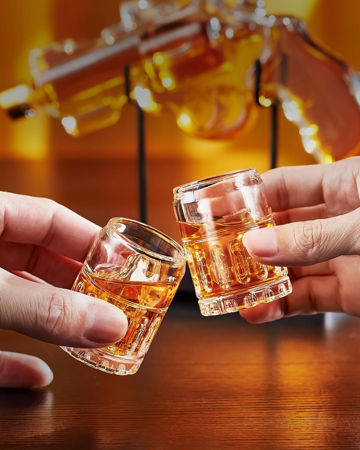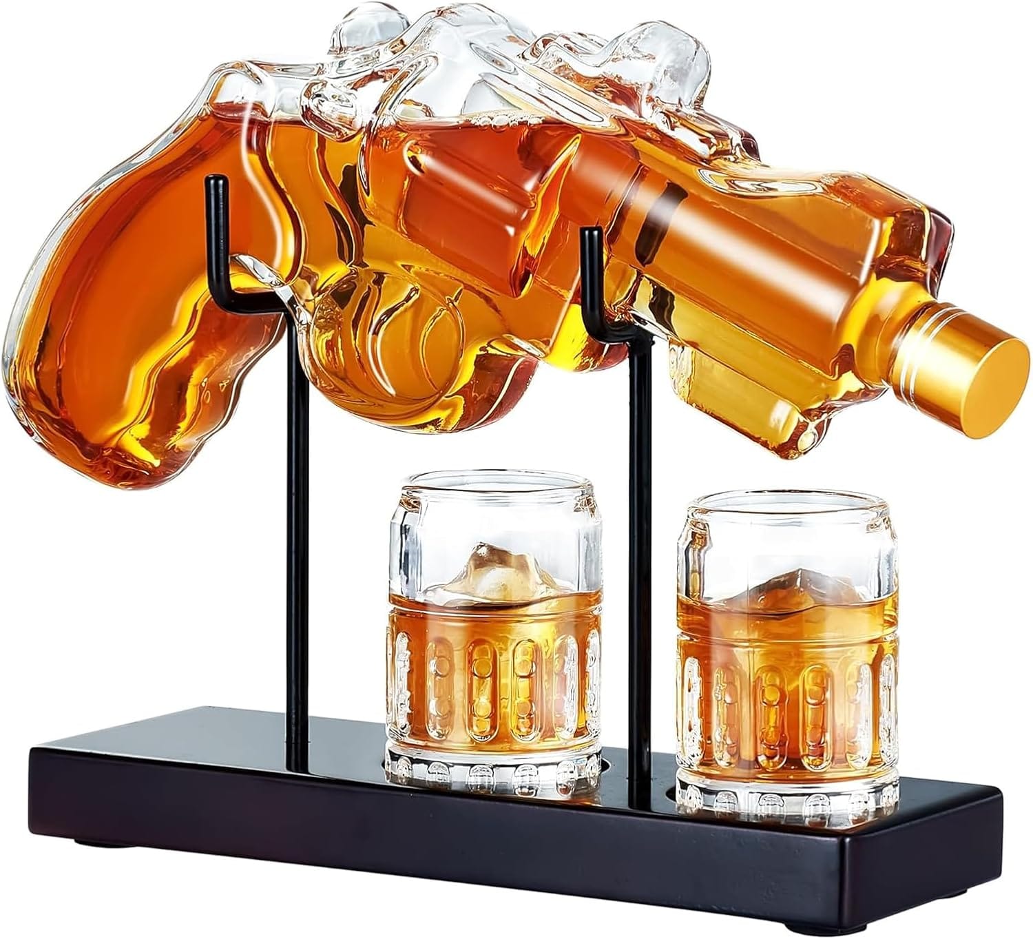 Handcrafted Revolver Design: This eye-catching whiskey decanter, shaped like a revolver, is meticulously handcrafted. It’s the perfect addition for military enthusiasts and collectors, serving both as a functional item and a tribute to the armed forces and veterans