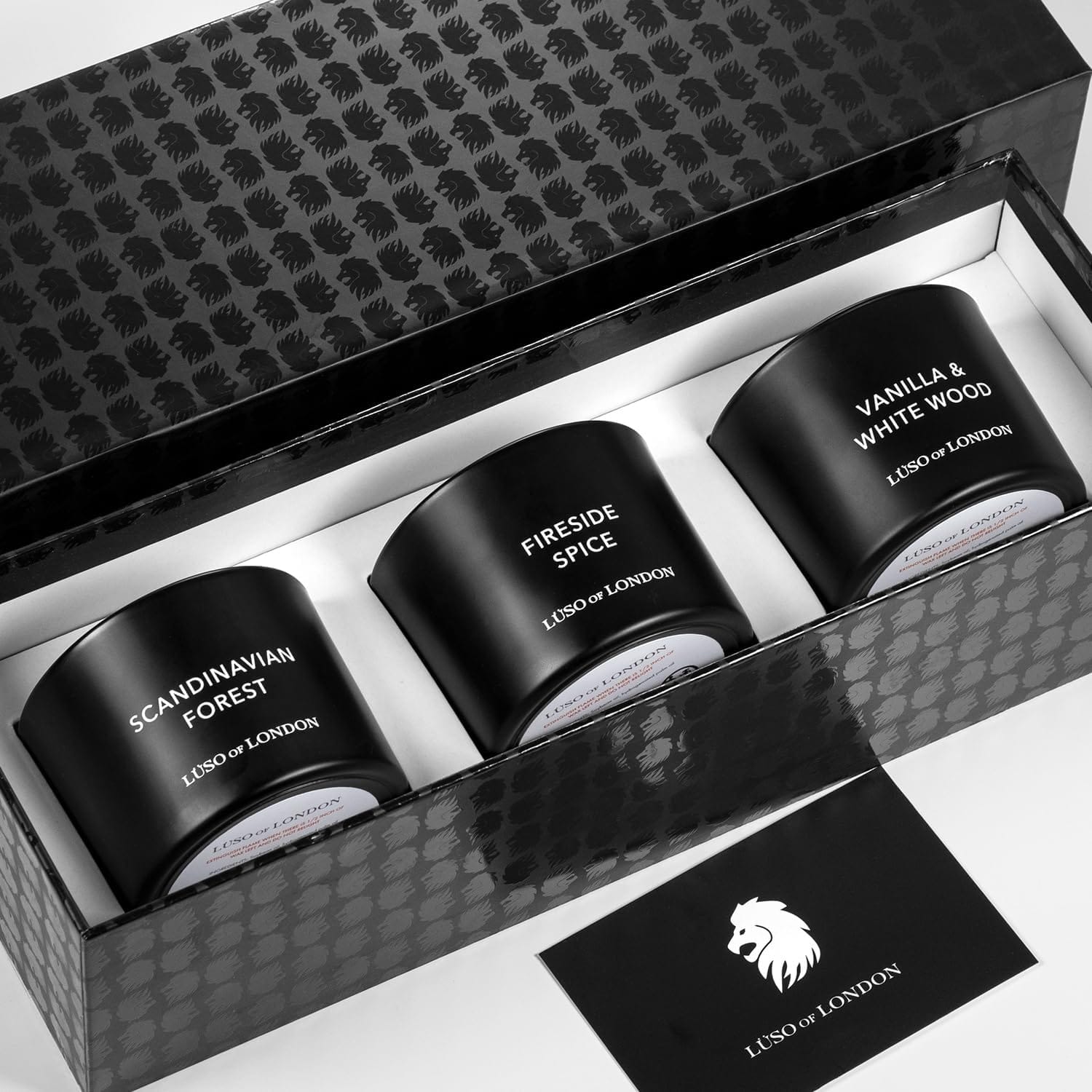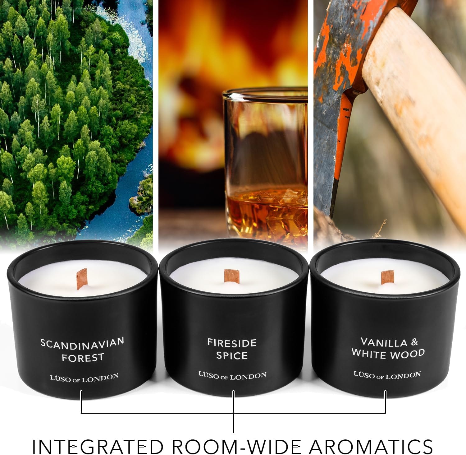 LÜSO of LONDON proudly presents a premium trio of strongly scented masculine candles, tailored with crackling wooden wicks in thermo-stable glass for the discerning modern man.