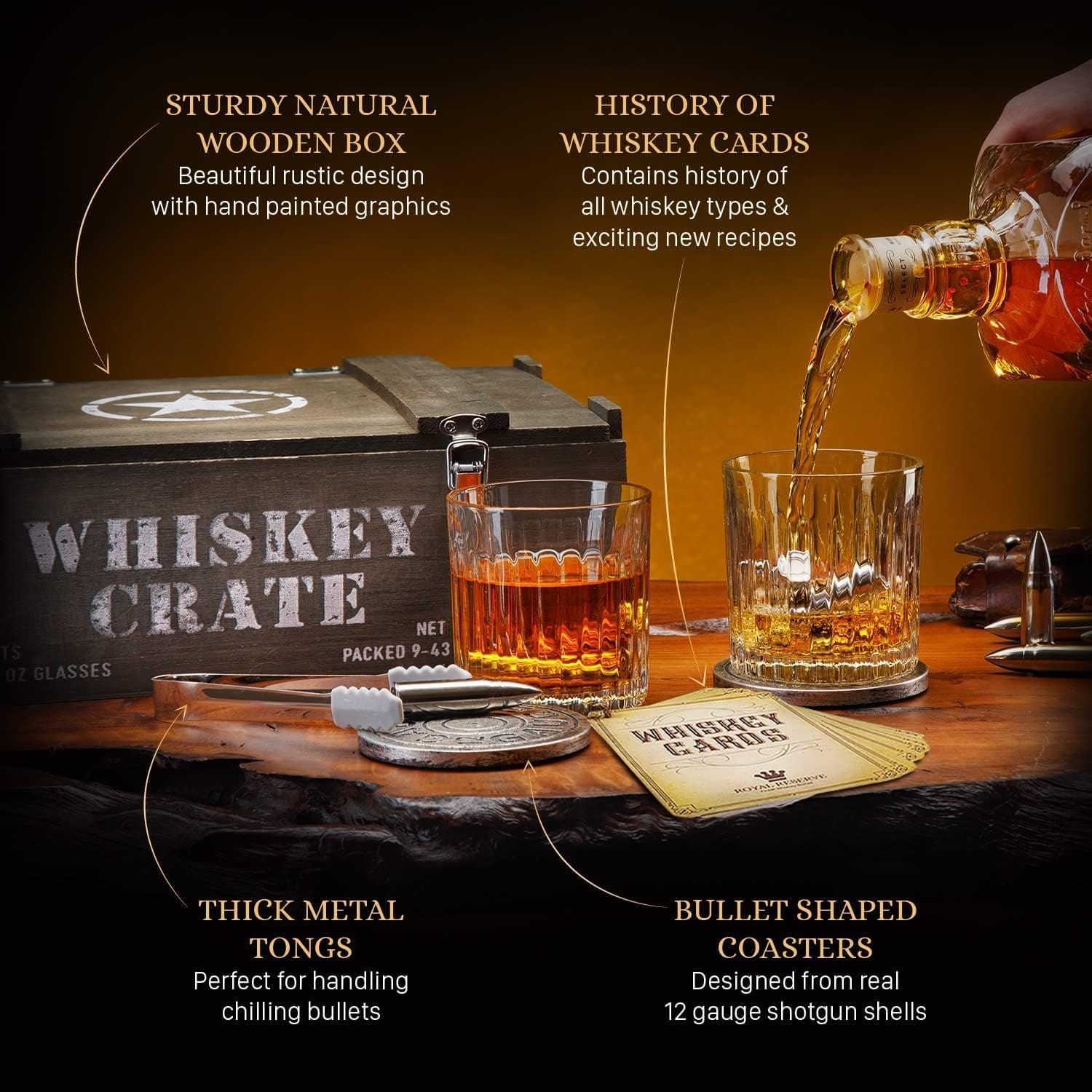 Bullet Whiskey Stones Gift Set by Royal Reserve | Artisan Crafted Whiskey Glasses, Coasters, Whiskey Crate – Christmas Whiskey Gifts for Men Husband Dad Boyfriend Ranger Hunter