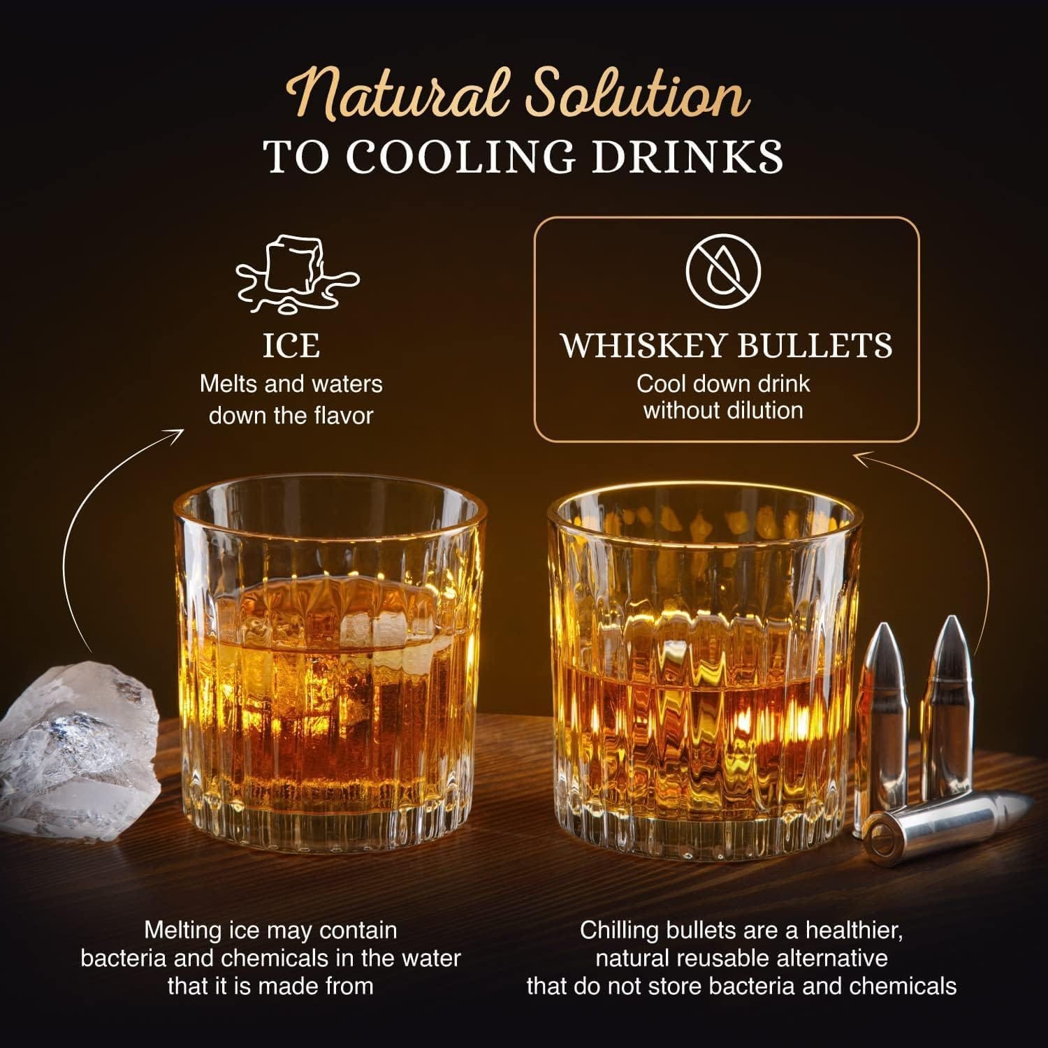 Ice Alternative: Made from polished stainless steel, our bullet ice cubes offer a cooling solution without dilution, ensuring the integrity of your drink. Non-porous, odorless, and polished for smoothness, they won’t scratch delicate whiskey glasses.