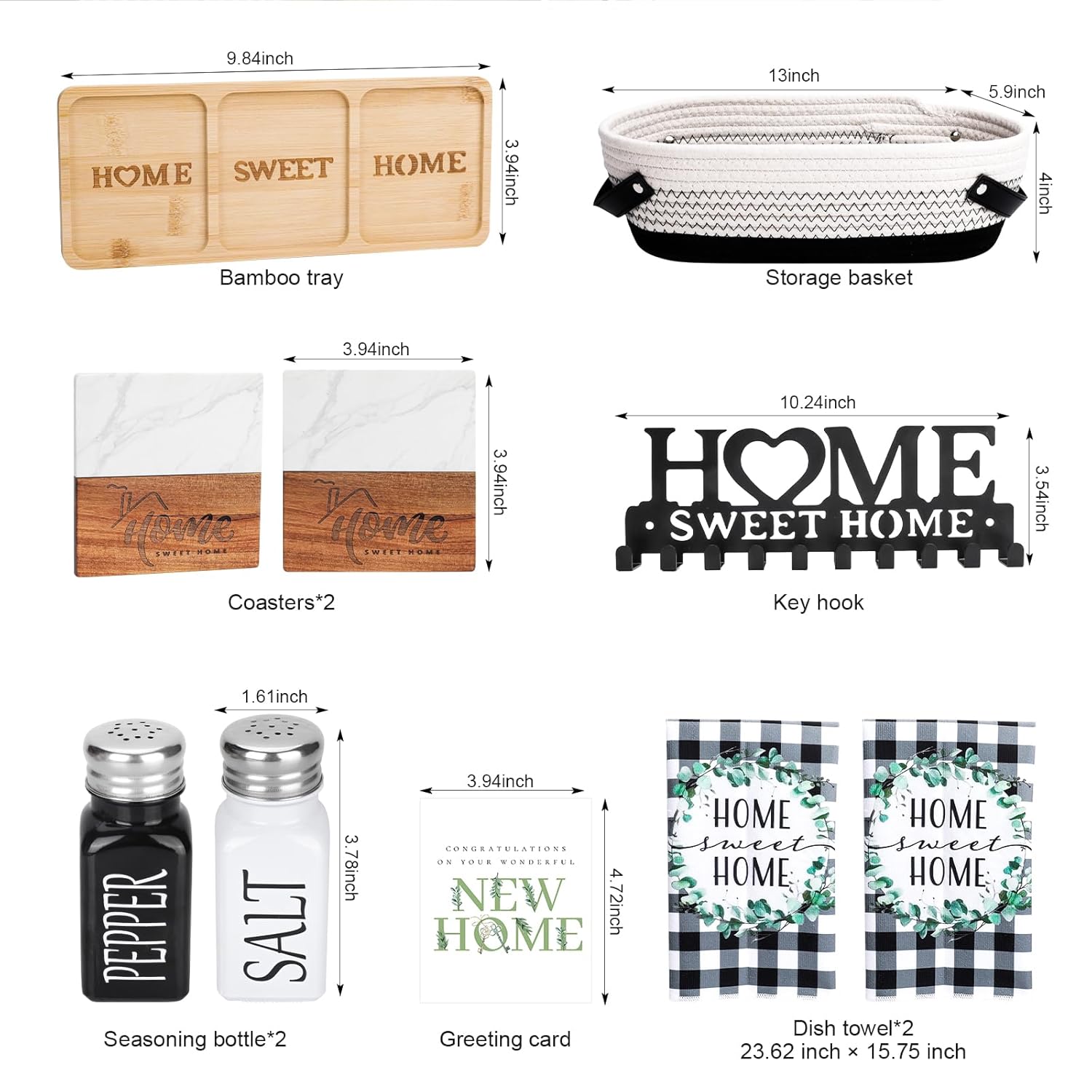 COMPLETE HOUSEWARMING GIFT BASKET SET:This thoughtfully curated gift basket includes 1 woven rope basket, 2 dish towels, 2 custom “Home Sweet Home” coasters, 2 spice jars (SALT & PEPPER), 1 bamboo snack tray, and 1 decorative key holder – everything needed to make a new house feel like home.