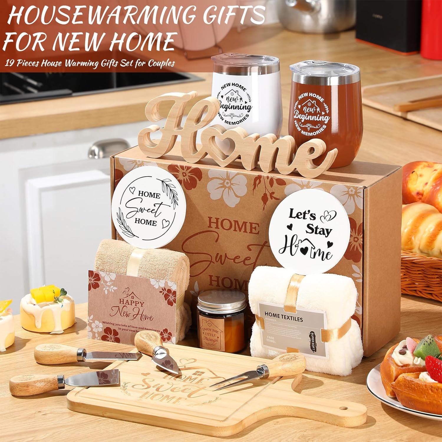 House Warming Gifts for New House: moving is a major event and memorable moment in life, if you want to prepare a housewarming gift, then you shouldn’t miss this housewarming gifts; The package included 1 bamboo serving board, 4 cheese knife, 2 towels, 1 scented candle jar, 1 Home wooden sign, 2 tumbler cups, 2 straw, 2 straw brush, 2 wooden coasters, 1 gift box and 1 card