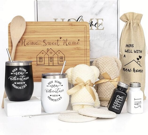 11 Practical Pieces – Gift Ideas for a New Home: This collection of practical items includes a personalized cutting board, two insulated wine tumblers, a wine gift bag, two decorative towels, a pair of cotton coasters, a wooden cooking spoon, salt and pepper shakers, all neatly presented in an attractive gift box.