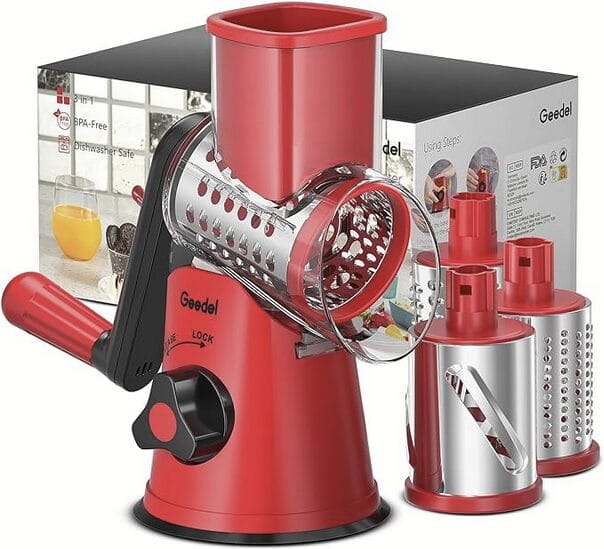 Geedel Rotary Cheese Grater, Kitchen Mandoline Vegetable Slicer with 3 Interchangeable Blades, Easy to Clean Grater for Fruit, Vegetables, Nuts.