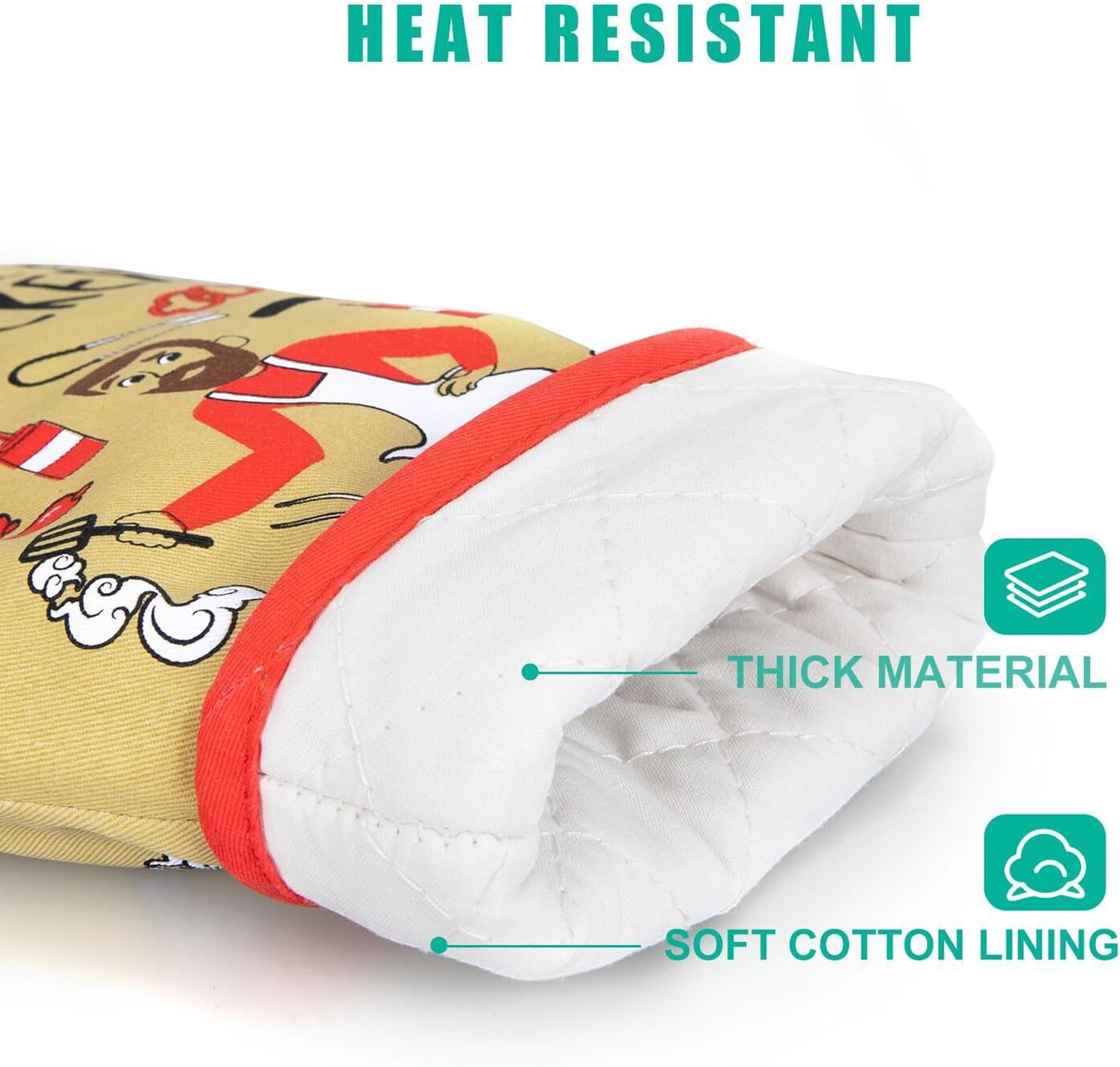 Three layers heat resistant material; Our oven mitts for men have a non-slip first layer, insulating cotton for heat resistance, and a breathable final layer; Thick material but still flexible enough to grip