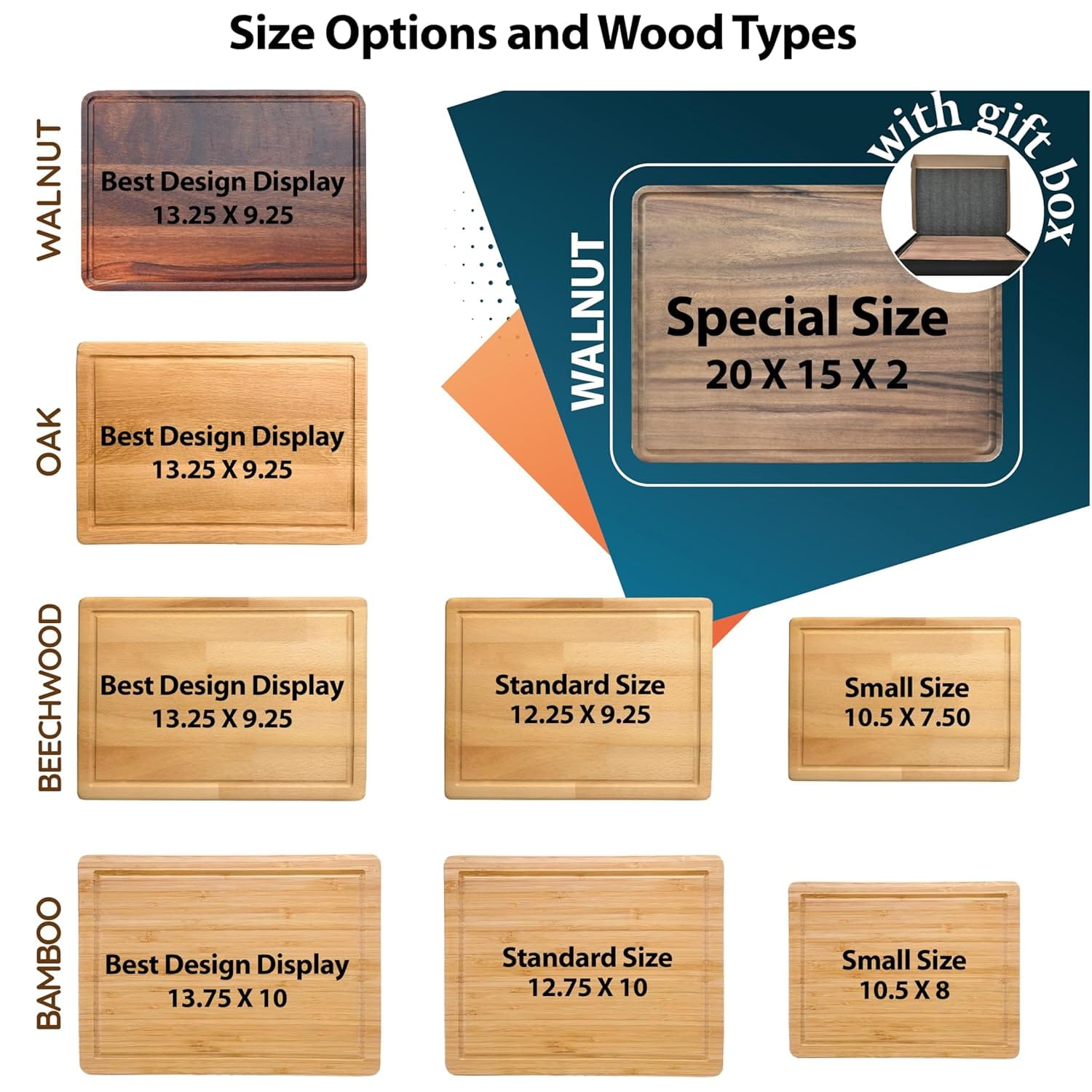 SKILLFULLY CRAFTED BEST QUALITY DIFFERENT WOODS: Our personalized cutting boards are available in 4 wooden types and different sizes for each one, such as WALNUT, OAK, BEECH, and BAMBOO in 4 sizes; Small (10.5″ x 8″), Standard (12.25″ x 9.25″), Best Design Display (13.75″ x 10″) and Special (20″ x 15″ x 2″). It’s up to you to choose the one that best suits your home and kitchen.