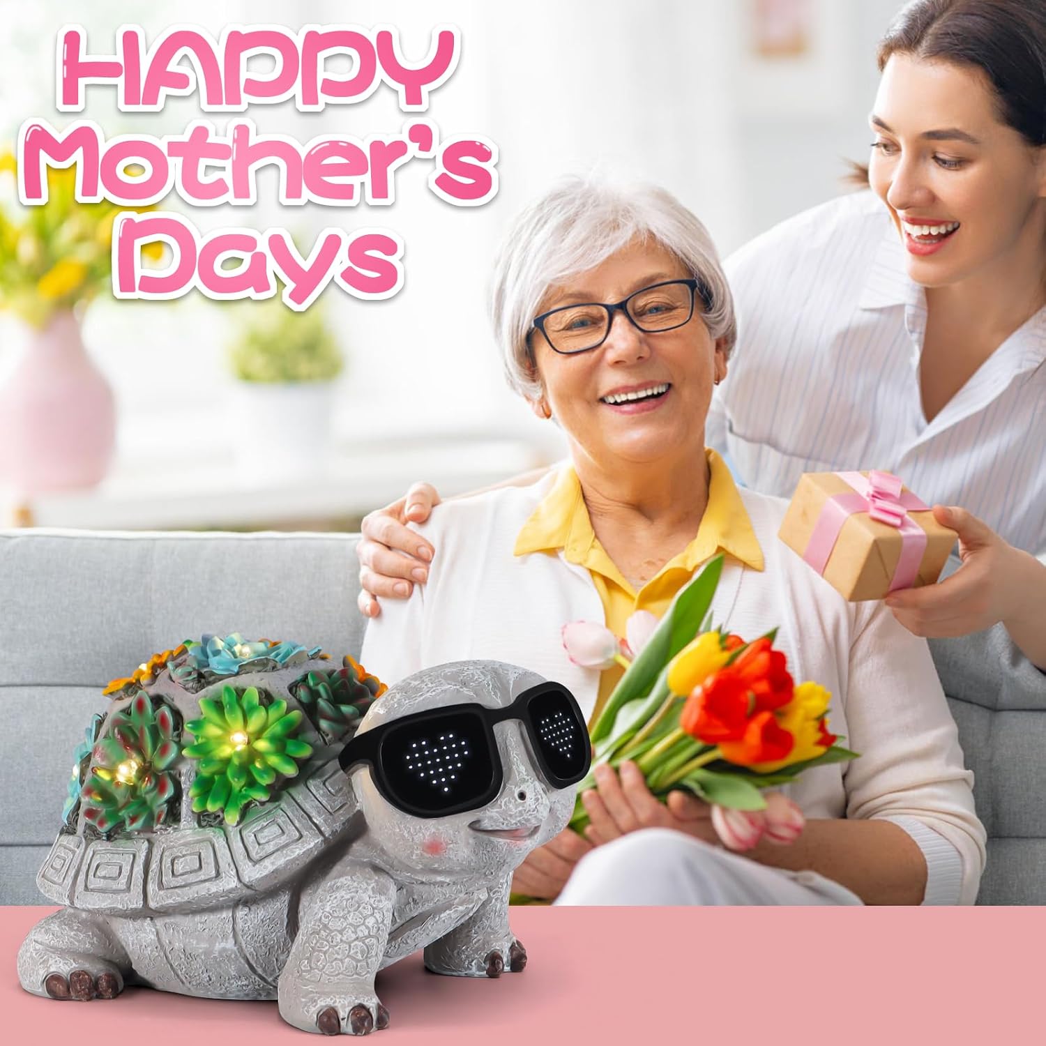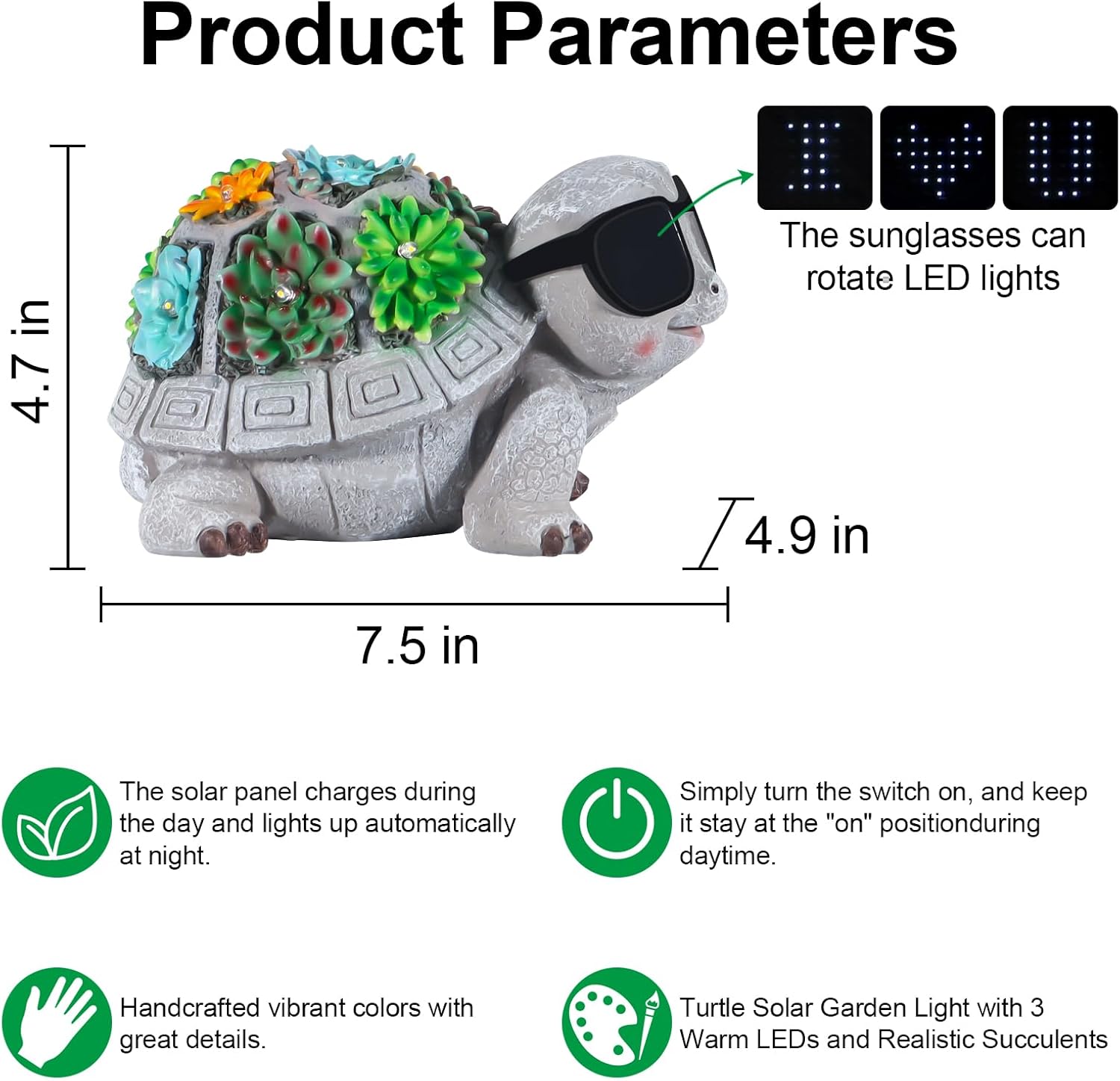 【Creative Lighting】The sunglasses on our turtle statue rotate the LED lights ‘i’, ‘❤︎’ and ‘U’, which is very creative, cool and cute and can add to your garden decor. A perfect addition to your outdoor space, this weatherproof statue exudes resilience and joy while lighting up your garden with eco-friendly solar power