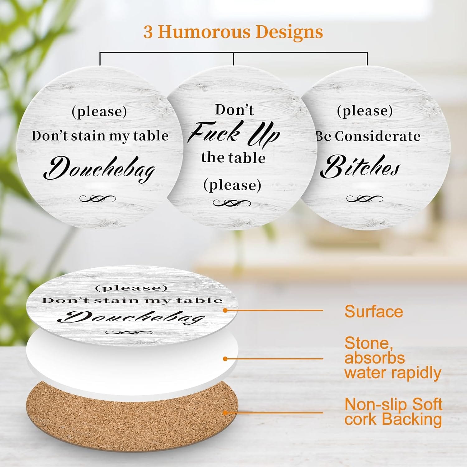 Without letting water stains mar your tabletop, but making the moment of display fun, sophisticated and unique – Our coaster sets make surprisingly funny gifts for men and women!